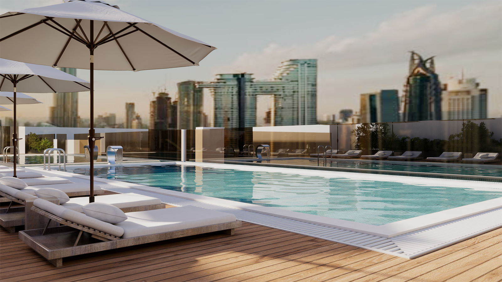 Infinity pool, gym, BBQ area, landscaped outdoor spaces, sunken seating, hotel-style lobby & dedicated parking.